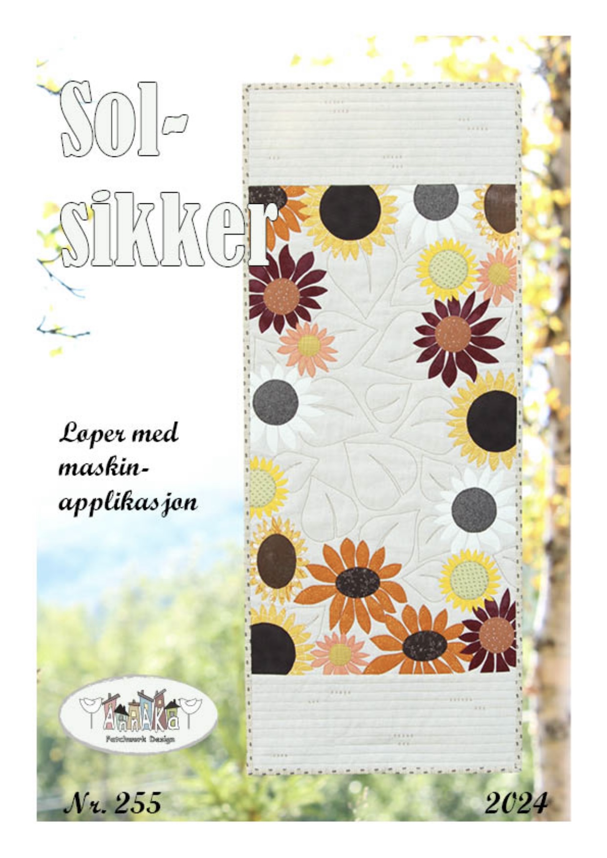 Beskrivelse Løper med maskinapplikerte solsikker og quiltede blader. I mønsterteksten finner du også inspirasjonstegninger til en smalere løper og brikke/putetrekk hvor samme applikasjoner er brukt. |