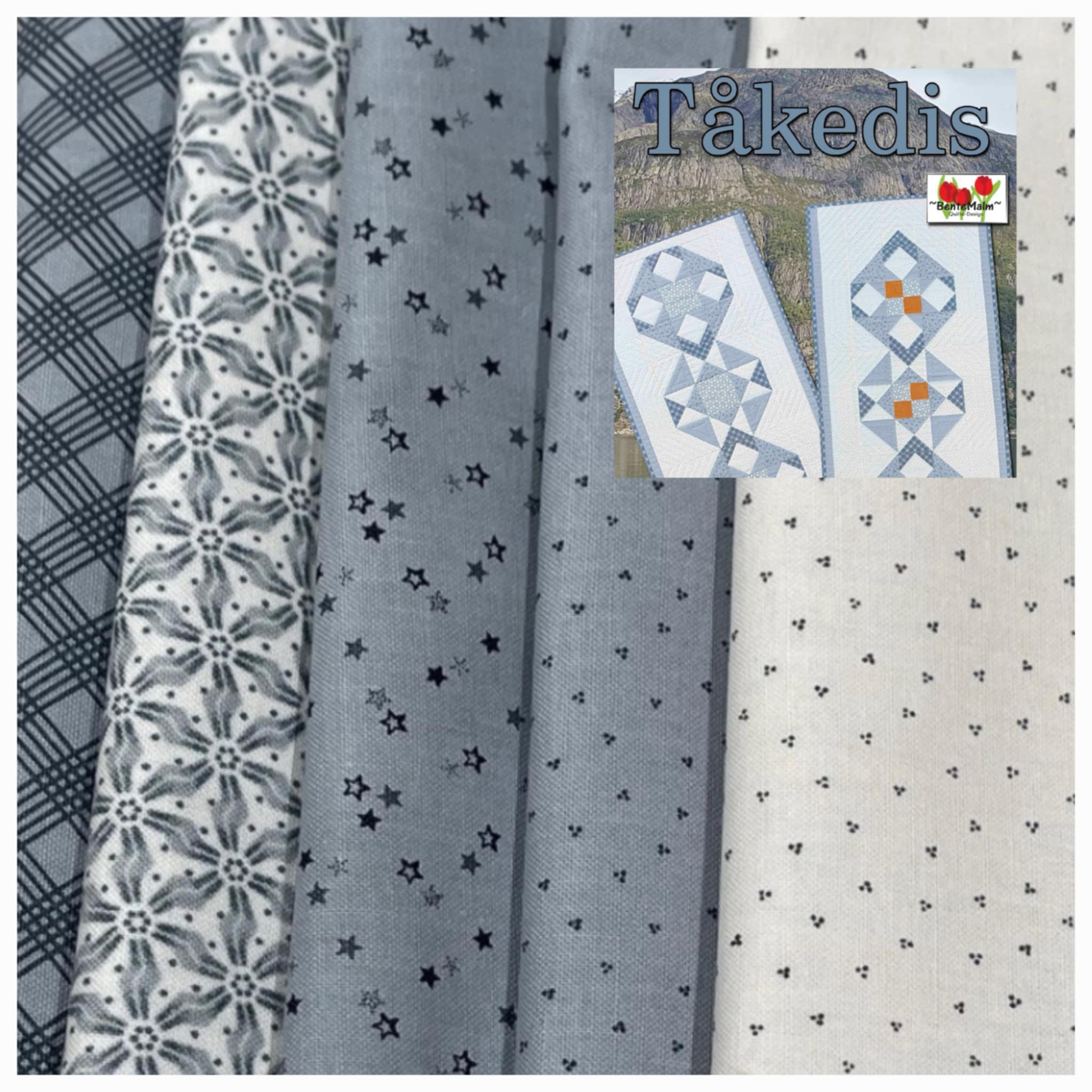 Beskrivelse Orginalstoffene til løperen Tåkedis. Her har vi lagt med ekstra av hovedstoffet slik at løper 1 også kan lages med lengre kant ute ved endene. Alle stoffene er med slik at du kan velge om du vil lage løper 1 eller 2. Det er med nok stoff til topp og lukkekant. Str, Løper 1, med 4 blokker: 16” x 38” (40 x 96 cm)Str, Løper 2, med orange ruter: 16” x 36” (40 x 91 cm) Teknikker: Tradisjonell lappeteknikk, quilting med rettsømsfot / overtransportør. Spesial-linjaler: Deb Tucker’s ’’Square 2’’ og ’’Tucker Trimmer’’ er gode,men ikke nødvendige hjelpemiddel. Mønster følger ikke med pakken |