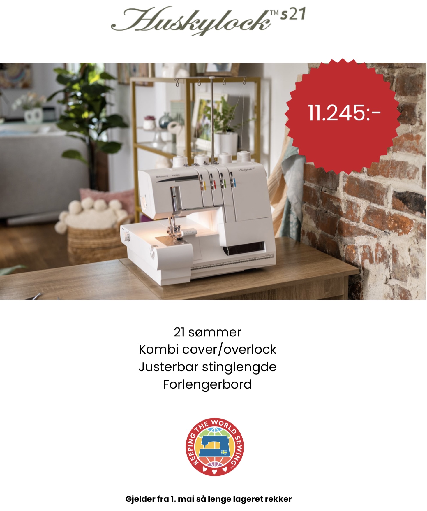 Beskrivelse Husqvarna Huskylock S 21 Mai tilbud, varer så lenge lageret rekker. Før pris 12,495kr NÅ KUN 11,245kr Kombi overlock/coverstitch. 21 sømmer. Stor syflate. Kaster over og skjærer kanten, alt i en søm! Elektronisk hastighetskontroll gir deg mulighet for å sy overlock med full nålgjennomtrengningskraft. FUNKSJONER: 21 sømmer, 4-tråds sikkerhetssøm, dekksøm (3 forskjellige), kjedesøm, flatlock, rullesøm, 5 nåleposisjoner, innebygd 2-tråds omformer, automatisk trådspenning, sikkerhetslås, ekstra trykkfotløft, sy med 2-4 tråder, snap-on trykkfotfeste, perfekte sømmer takket være differensialmating, fargekodet treing, tilbehørsboks med mye tilbehør, stor plass under trykkfoten, stingplate behøver ikke å byttes ved sømskifte, avfallsoppsamler, forlengerbord, justerbar stinglengde og stingbredde, justerbart trykkfotstrykk, mykt deksel. |