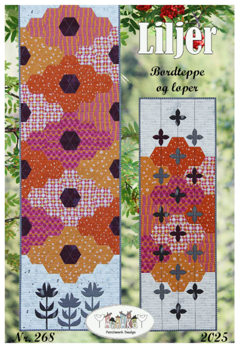 Beskrivelse Løpere i 2 størrelser med hexagon-blokker og applikasjon. Maskinsøm. Hexagon-blokkene kuttes med 'Hex N More'-linjal, eller ved bruk av mal i mønsteret. Enkel patchwork-teknikk. Løperne måler; Stor løper: 21 1/4" x 79" (54 x 200,5 cm). - (Denne er lang, men flott til et bord med 4 stk på hver side) Liten løper: 16" x 47 3/4" (40,5 x 121 cm) Vi har laget materialpakke til både stor pg liten løper. Se nedenfor. Vi har alle stoffene på rull og de kan bestilles nedenfor. Løper er quiltet med nesten hvit tråd. Vi har funnet frem 2 farger vi bruker nye. Fargen soft white og en flerfarget. Begge fra Wonderfil. Du som er med på vårt AnnAKa abnm får 10% rabatt på mønster og materialpakker. |