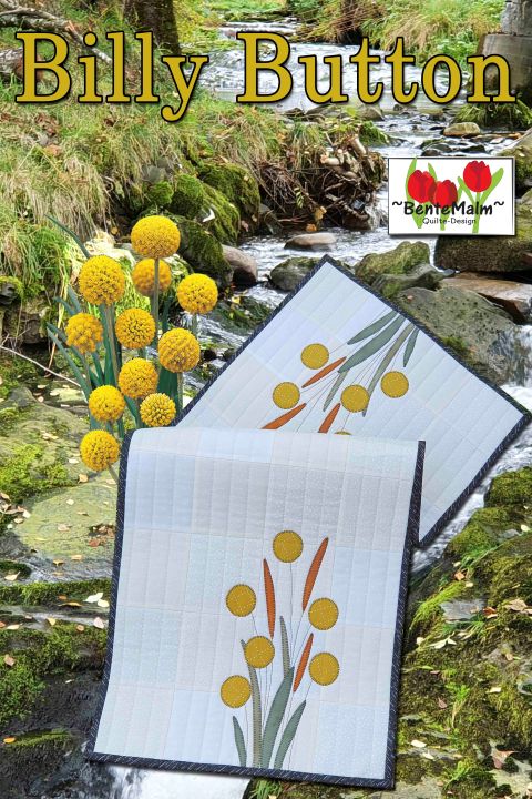 Beskrivelse Enkel løper med applikasjoner. Inspirasjon til applikasjonene kommer fra en litt spesiell plante jeg kjøpte, med knall gule, runde baller på tynne stilker. Det viser seg at planten heter ’’Craspedia Billy Buttons’’, og at ’’ballene’’ i tidligere tider ble brukt til å lage knapper av. Str: 16” x 36” (40 x 90 cm). Teknikker: Tradisjonell lappeteknikk, quilting med rettsømsfot / overtransportør, applikasjon med knapphullsting (maskinsøm). Stilker er sydd med 3 stings rettsøm (maskinsøm). De kan evt syes for hånd (attersting / kontursting). |