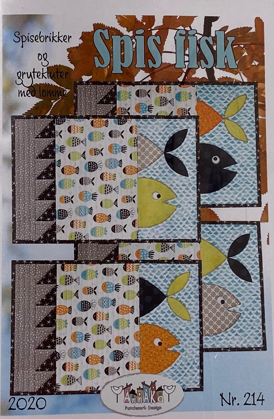 Spisebrikker , grytekluter med morsom vri og med fiske mønster. Mønstret er på 4 spisebrikker og grytekluter