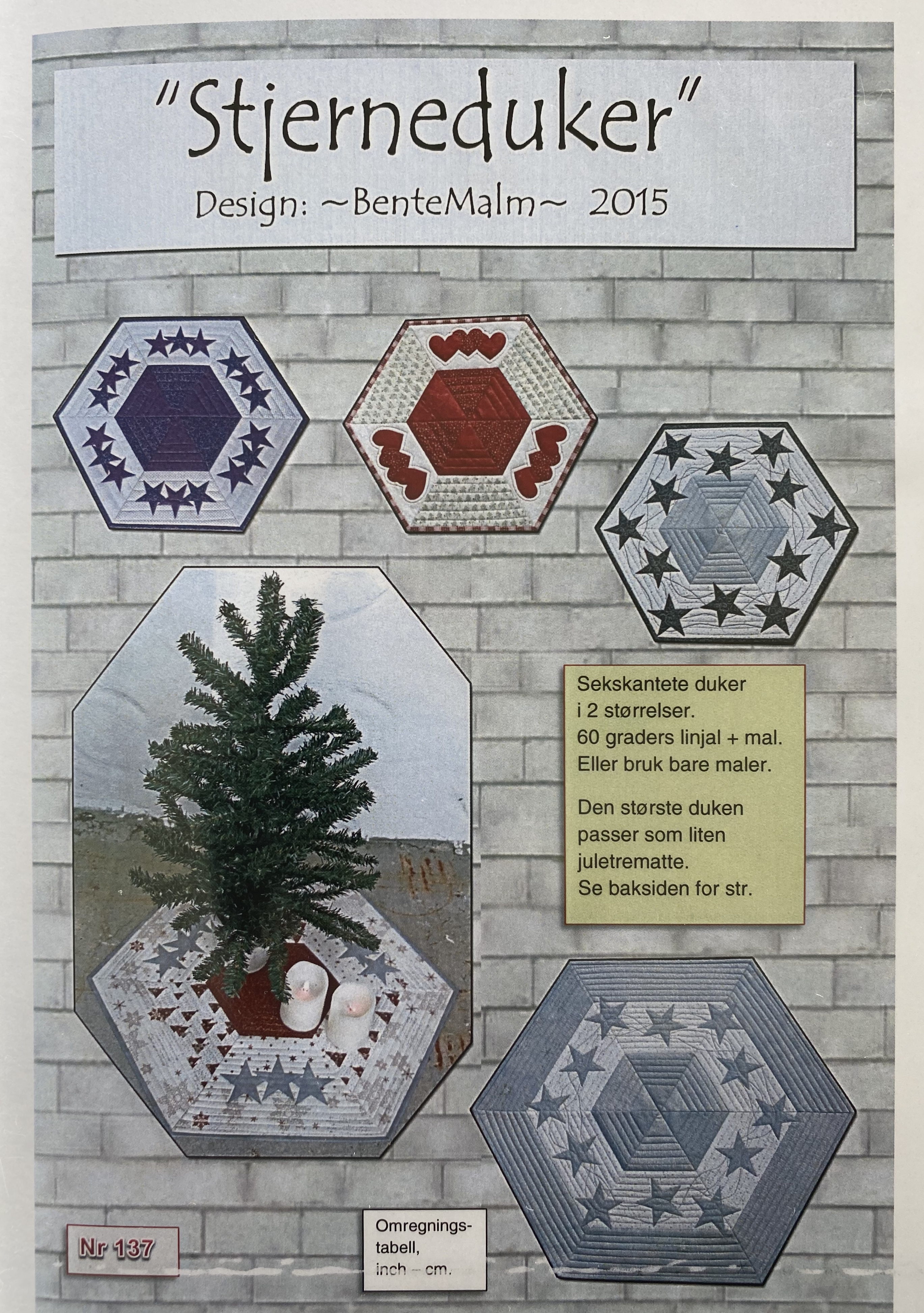 Beskrivelse Små duker en kan tilpasse til alle årstider som høst , vår , sommer og vinter. Fine som juleduker. Str. stor duk: 63,5 cm x 73,5 cm. Liten duk: 47 cm x 54,5 cm. Her kan du bruker en 60 graders linjal eller malen som følger med mønster. Det er applikert stjerner eller hjerter på dukene. De passer fint både til advent og til jul. Den store duken kan også brukes som vanlig borduk ( i stedenfor kvadratisk snippduk) Dukene er raske og enkle å lage. |