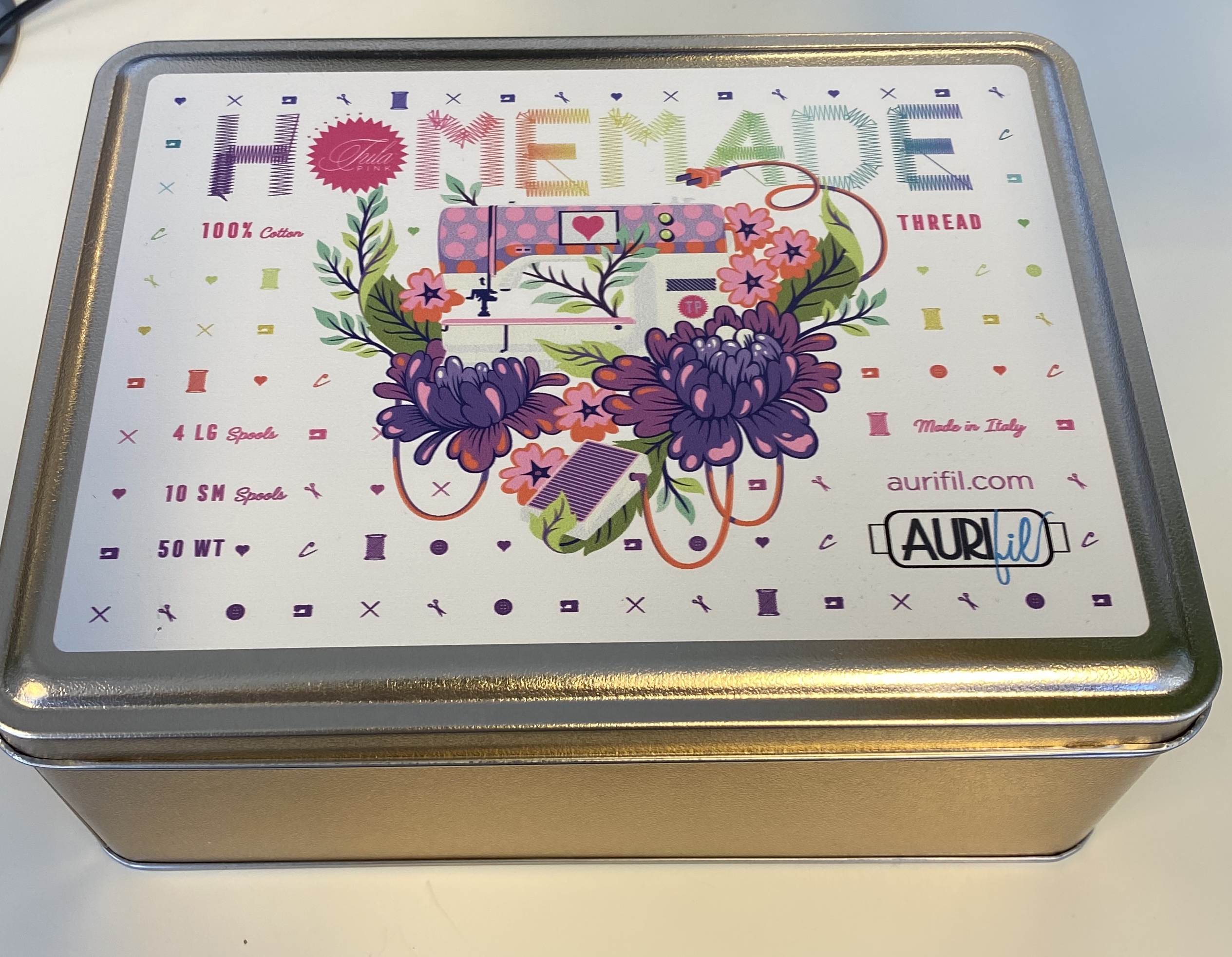 Beskrivelse Eksklusivt trådskrin fra TulaPink i serien Homemade. 4 store trådsneller à 1300 m, og 8 små trådsneller à 200m. Alle i 50 WT tykkelse. Fin bommullstråd i god kvalitet som bygger lite når du syr / quilter. |