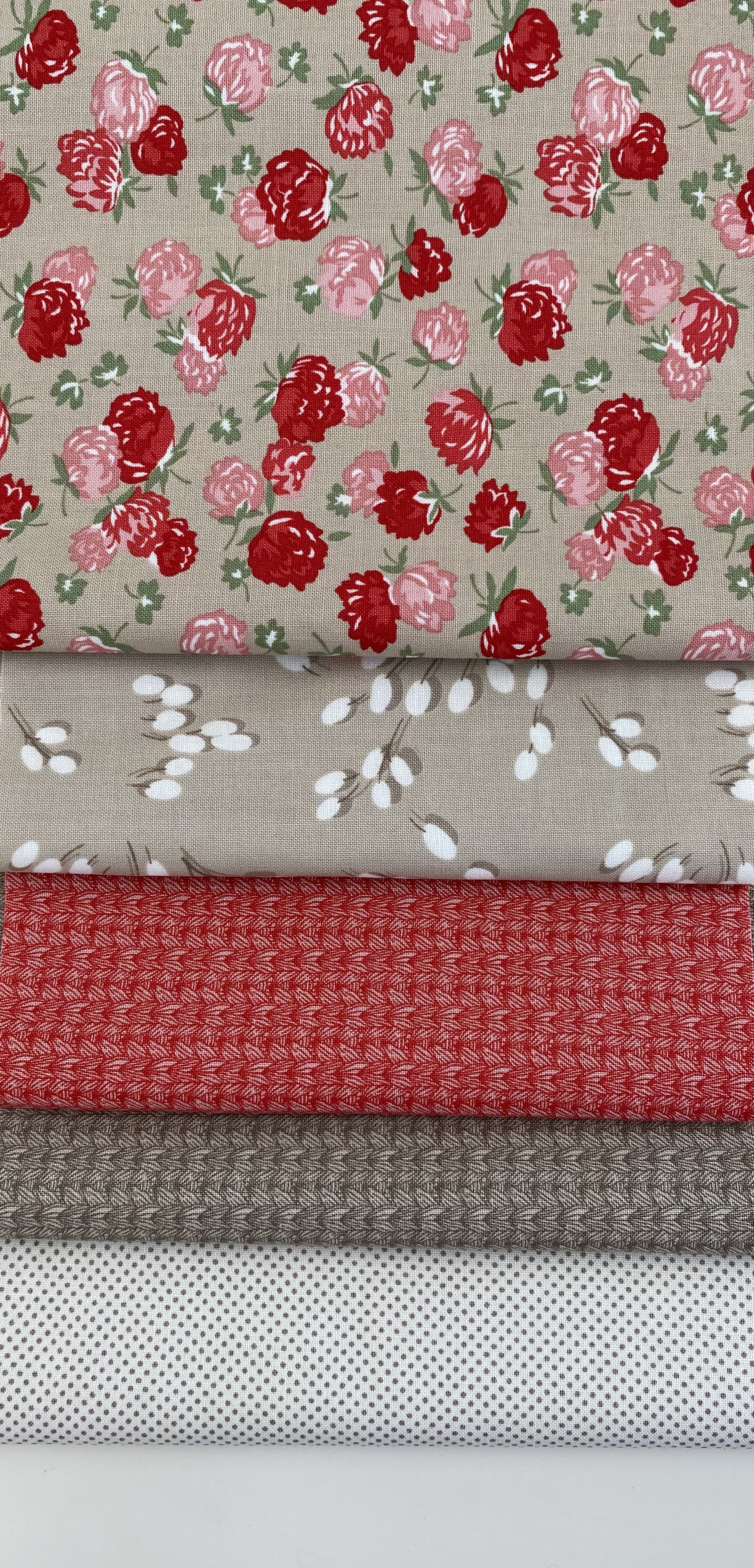 Orginal stoffene til Rødkløver løperen til Bente Malm. Løpere er 40,5 cm x 90 cm. Her får du med alle stoffene i pakken. Husk å bestill vatt og mønster til pakken.