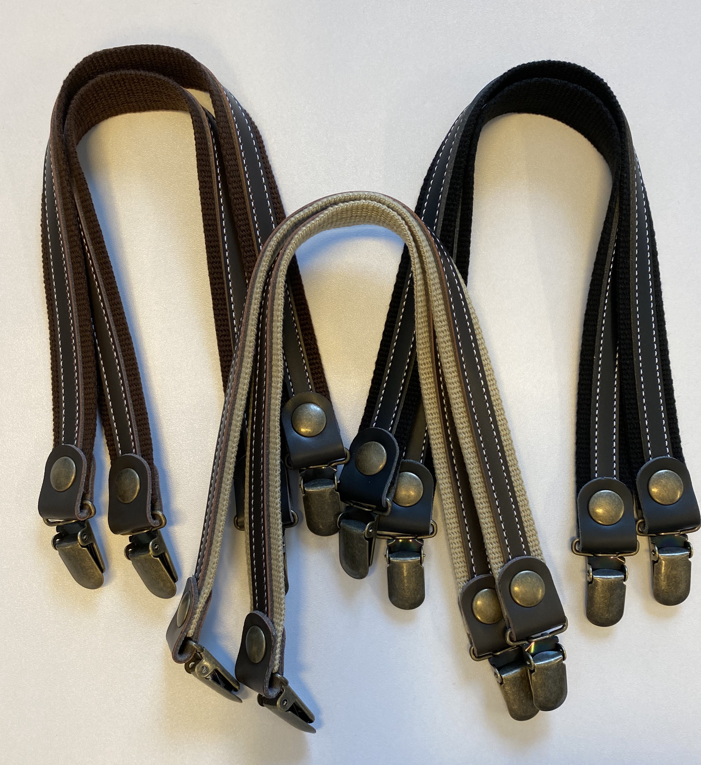 Beskrivelse Veskehank i webbing i tre farger. Brun , sort, og natur. Disse leveres med 2 stk i pakken, og festes med klips. Klipsene er sterke, og sitter godt. Bente Malm har brukt disse i bla fineværsveska |