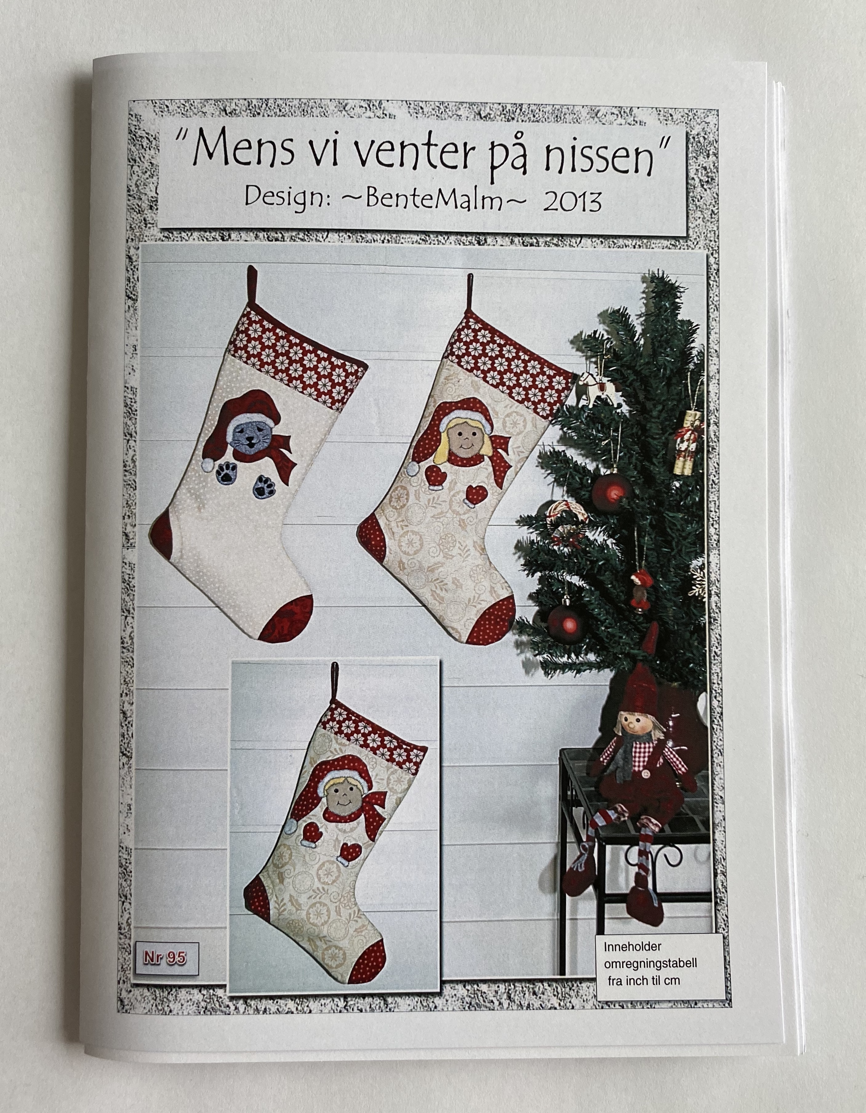 Beskrivelse Julestrømpe i 2 str med applikasjon. Strømpene har god fasong, med innfelt høl ( innsnitt) Det brukes samme applikasjonstegninger på begge størrelsene. Str stor strømpe : 29 cm x 42 cm Liten strømpe: 25,5 cm x 37 cm. Teknikker: Vanlig lappeteknikk, quilting med rettsømsfot, applikasjon med maskin. Mønstret inneholder egen liste der alle inch måler omsatt til cm. Det er liten forskjll på stoffmengden på liten og stor strømpe, og målene er oppgitt for en strømpe. Ønsker du forslag til materialpakke så spør om vi kan være behjelpelig med å sette sammen stoffer :) Bortsett fra stoffene og mønstret trenger du til prosjektet: Syntetisk bordvatt ( støttestoff) Vlisofix Evt moulinègarn små rester av sort |