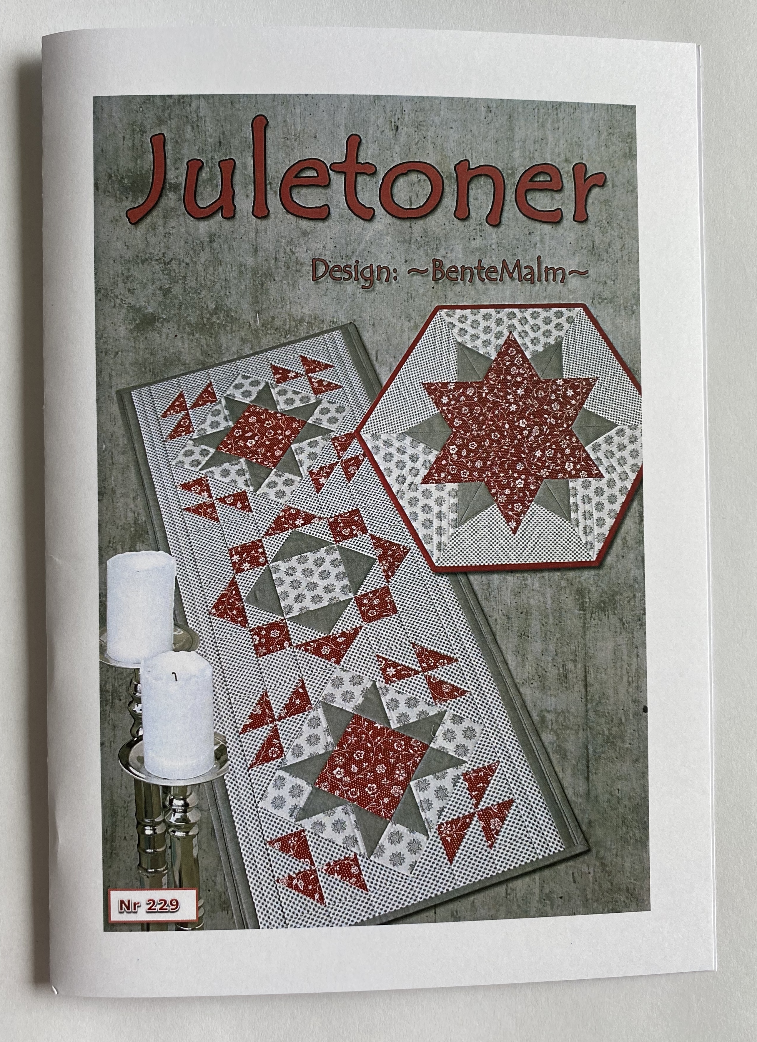Beskrivelse Løper og brikke i tradisjonell lappeteknikk. Juleløper men denne kan også fint brukes hele året om man velger andre typer stoffer. Str. Løper: 42 cm x 99 cm. Str Brikke: 55 cm i diameter. Brikken lages med 60 graders linjal eller med mal fra mønsteret. Stjernen er delvis applikert |