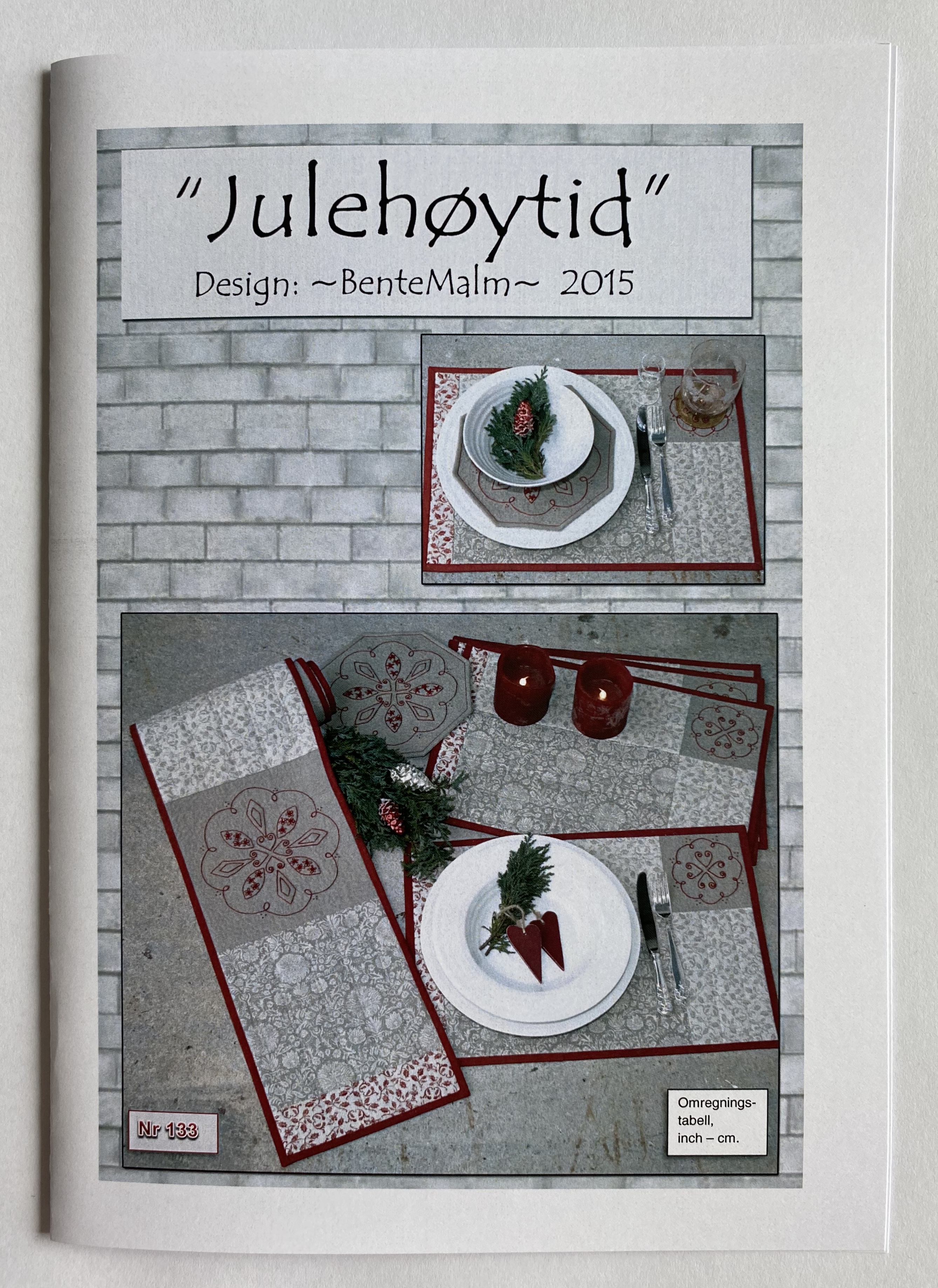 Beskrivelse Dekkbrikke , festremse og tallerkendemper sydd i halvlin. Str. Dekkbrikke: 46,5 cm x 31 cm. Str.festrems 24 cm x 126 cm. Str. tallerkendemper. Teknikker: Tradisjonell lappeteknikk og broderi for hånden. |