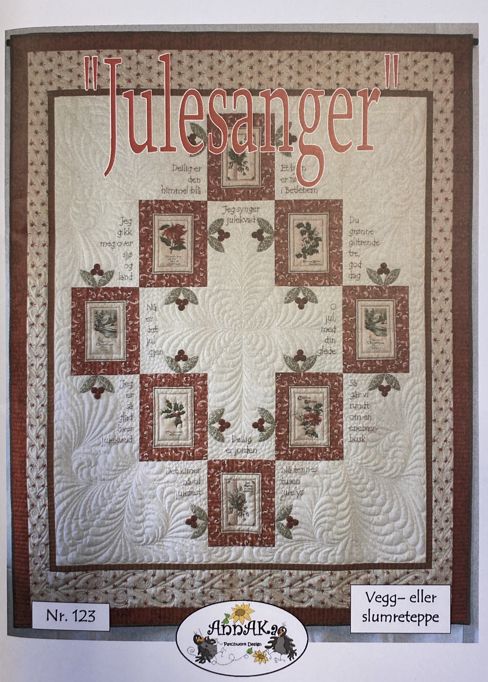 Beskrivelse Dette kan du lage som veggbilde eller slumreteppe. 8 motiver med tekst og applikasjon. Dette skal forestille julekort. Blomstene lages med Yo-Yo mal. Teppet måler 132 cm x 169 cm |