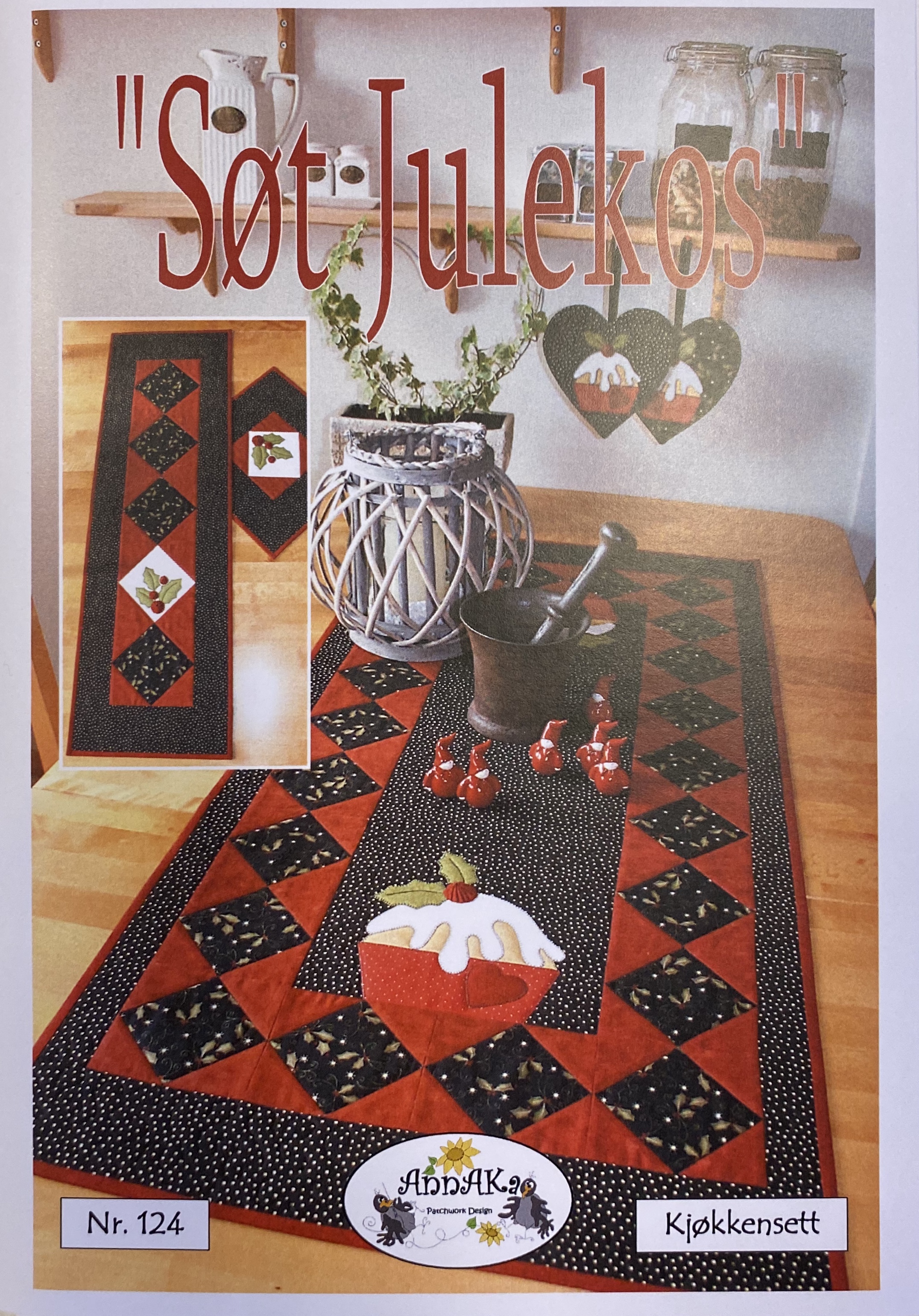 Beskrivelse Et fult kjøkkenet fra AnnaKa. Mål på Stor løper ; 54 cm x 119cm. Liten løper 32cm x 100,5Cm. Brikke. 35,5cm x 35,5cm. Grytekluter 19cm x 20 cm. Duk og brikke kan lages med og uten applikasjon |