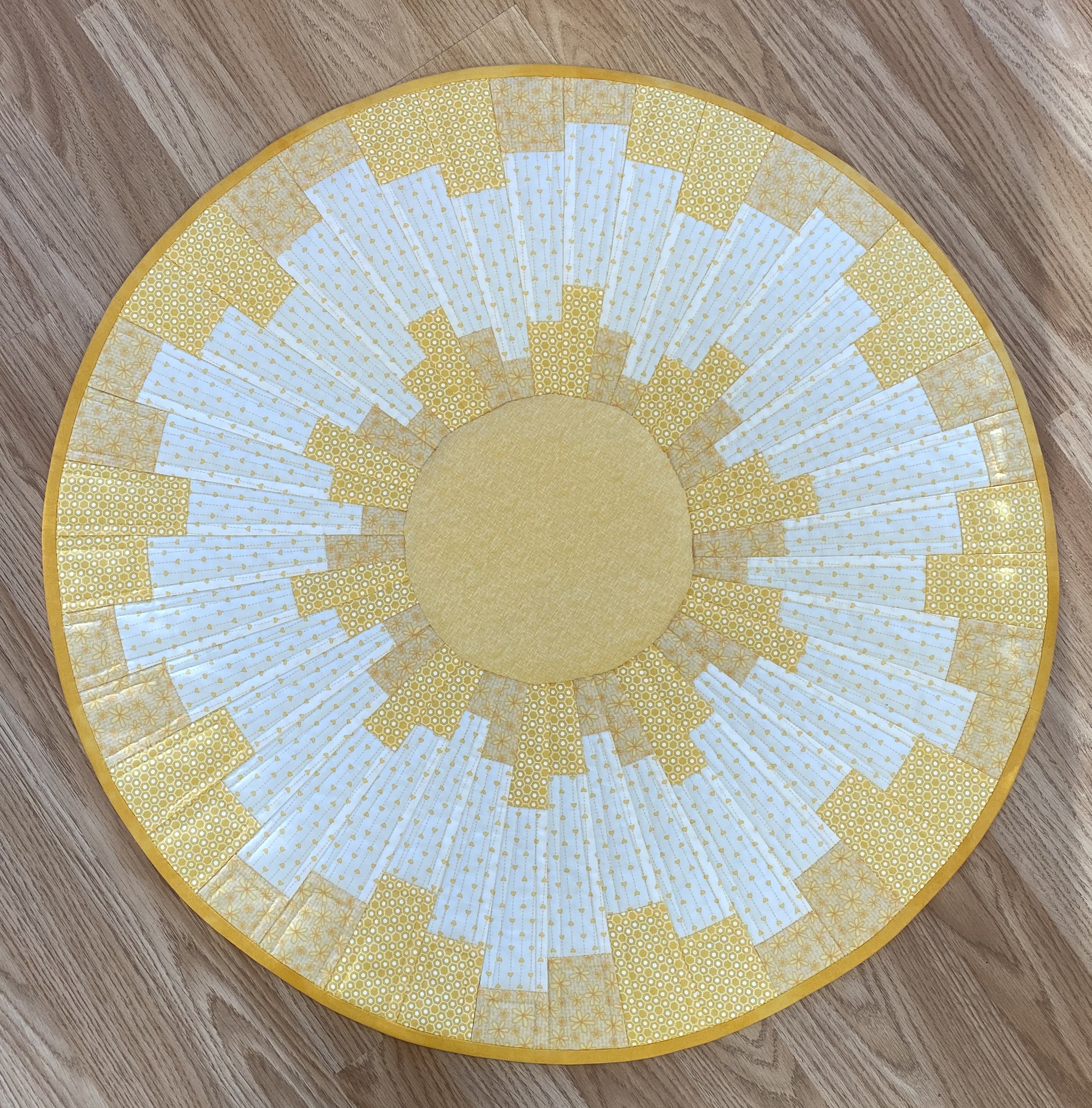 Beskrivelse Flott duk hvor AnnaKa har brukt Two piece Ten degree wedge linjalen for å få til den fine sirkelen. ( du finner linjalen under Linjaler i nettbutikken) I materialpakken får du med alle stoffene som du trenger for å lage duken på 81 cm ( stor duk) I sirkelen i midten har Ann brukt Applique paper. ( medfølger 1 ark) Men du kan også velge å bare kutte en rund ring og applikerer rundt med knapphullsting. Du kan velge om du ønsker å lage duken i lilla, hvit eller gul. Stoffene kommer nummerert i fht hvor de er tenkt å være i mønstret I tillegg til materialpakken trenger du: Mønster Gul tråd ( brukt gütermann farge 852 - 2 stk ) ( legges ved om ønskelig) Bordvatt |
