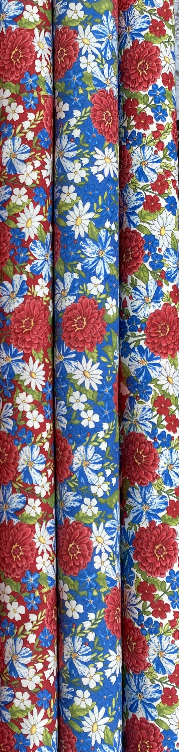 Beskrivelse Bomulstoff fra Moda i 100 % fast bomull med bredde på 110 cm. Stoffene er i tre farger med rød , hvit og blå bakgrunn. Disse passer fint med serien American Gatherings som jeg har tenkt var fine stoffer til fex en mai løper. Som løper vil jeg foreslå Broken dishes som du også vil finne i vår nettbutikk. |