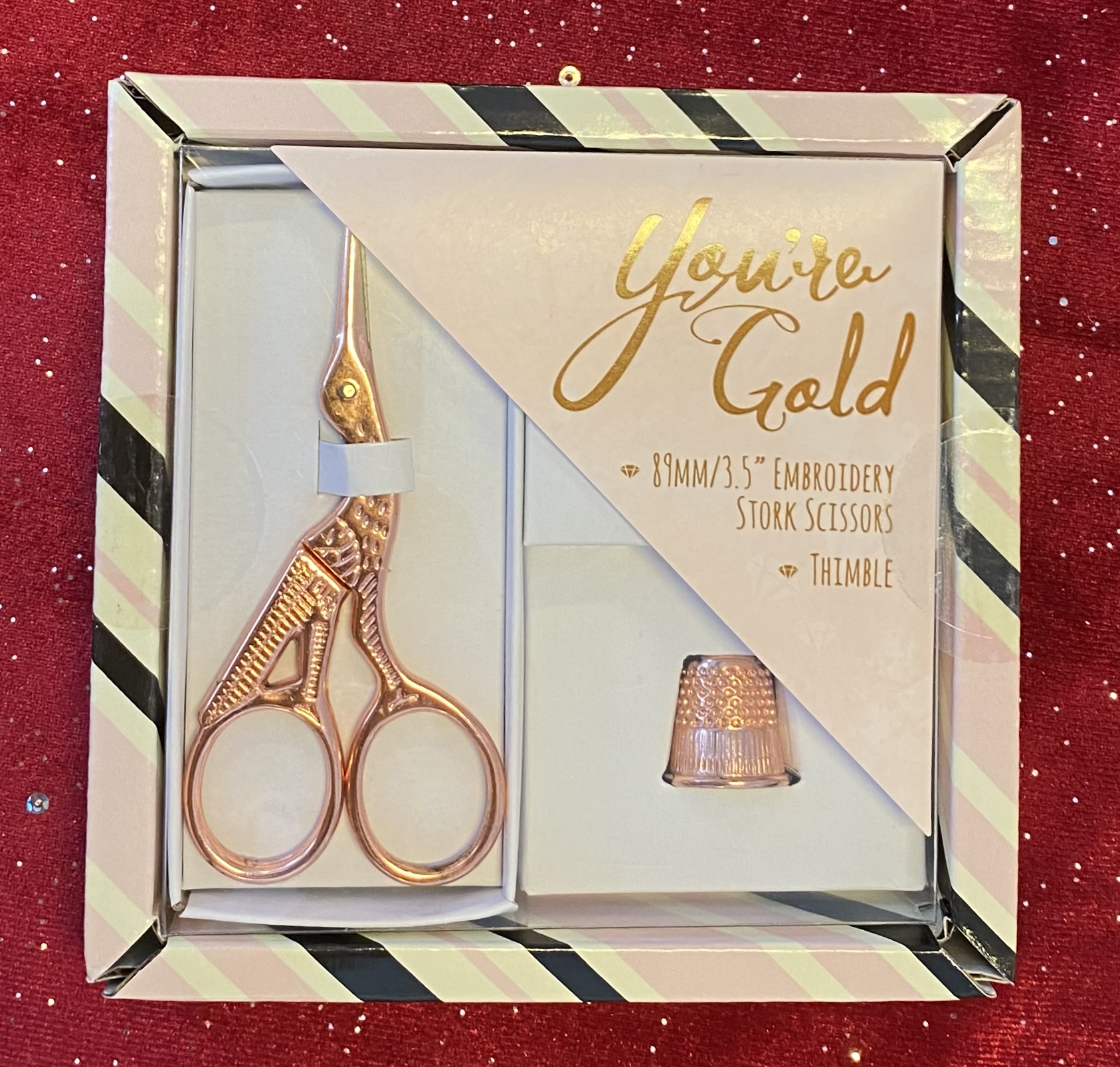 Beskrivelse Fint sett med storkesaks og fingerbøl i gull farge. Saksen er skarp og passer fint til små arbeider slik som for eksempel broderi arbeid. Leveres i fin gave etui innpakning |