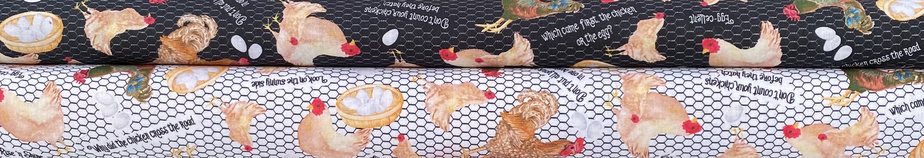 Påskestoffer i 100% fast bomull i sort og hvitt med hønsenetting i bakgrunn. Bredde 110 cm