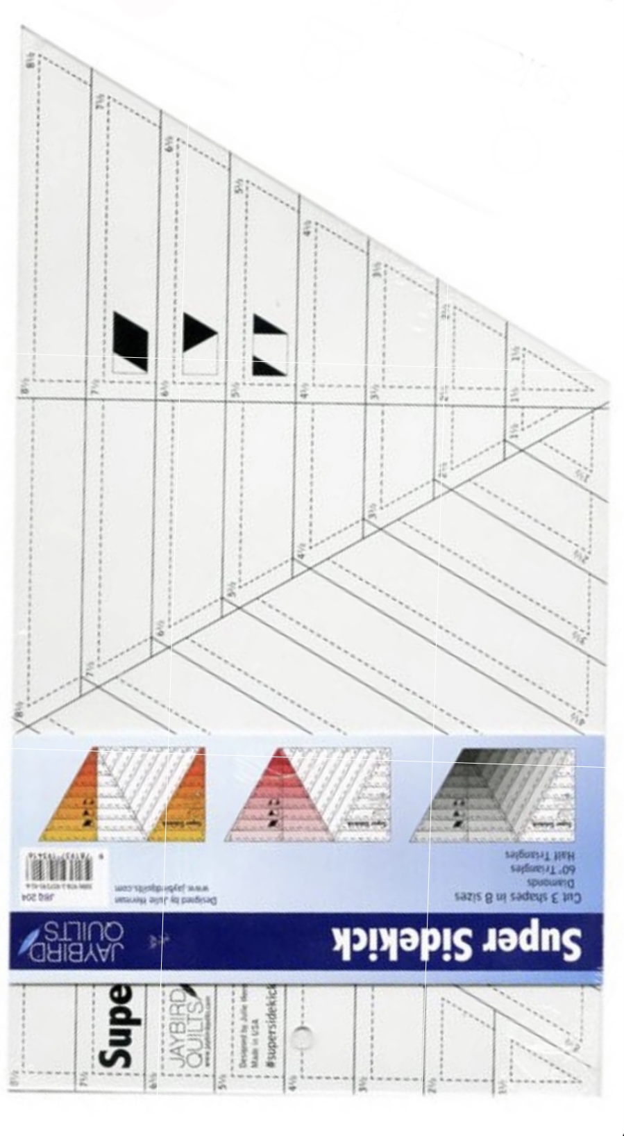 Beskrivelse Super sidekick linjal som man for eksempel bruker til Tula pink sitt store sengeteppe nebula. Med denne kan du kutte 3 varianter av trekanter i 8 forskjellige størrelser. Du har en stor diamant linjal , 60 graders triangel, halv triangel. Ja rett og slett en linjal med stort bruksområde |