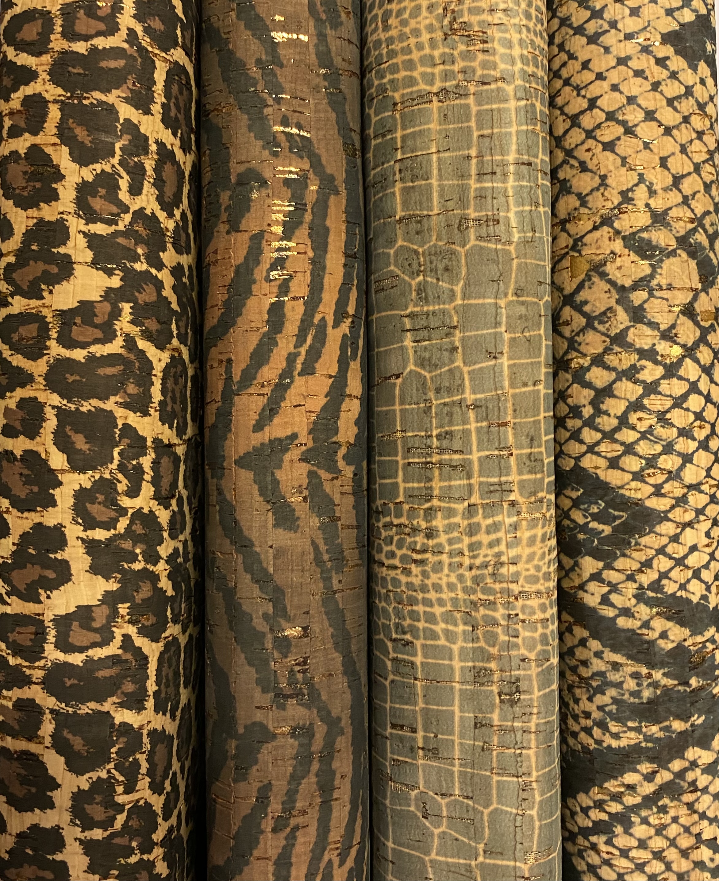 50 % kork , 48 % polycotton og 2 % lim. Leveres i den lengde du ønsker, og er 24’’ bred. Disse kan brukes til vesker, toalettmapper mm