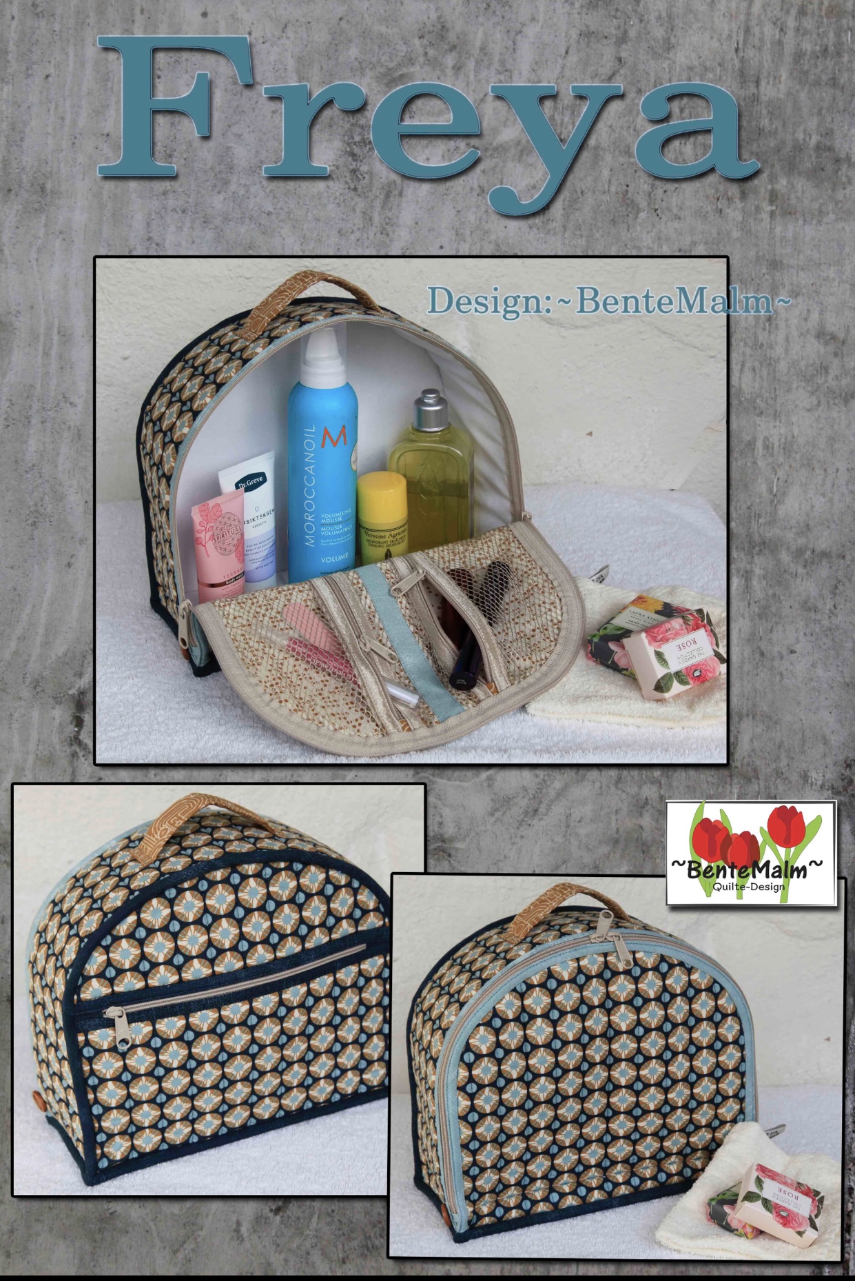 Stor og fin toalettmappe fra Bente Malm. Denne har hun laget med en innside med plast frotte. Vi har materialpakke på denne i orginalstoffene