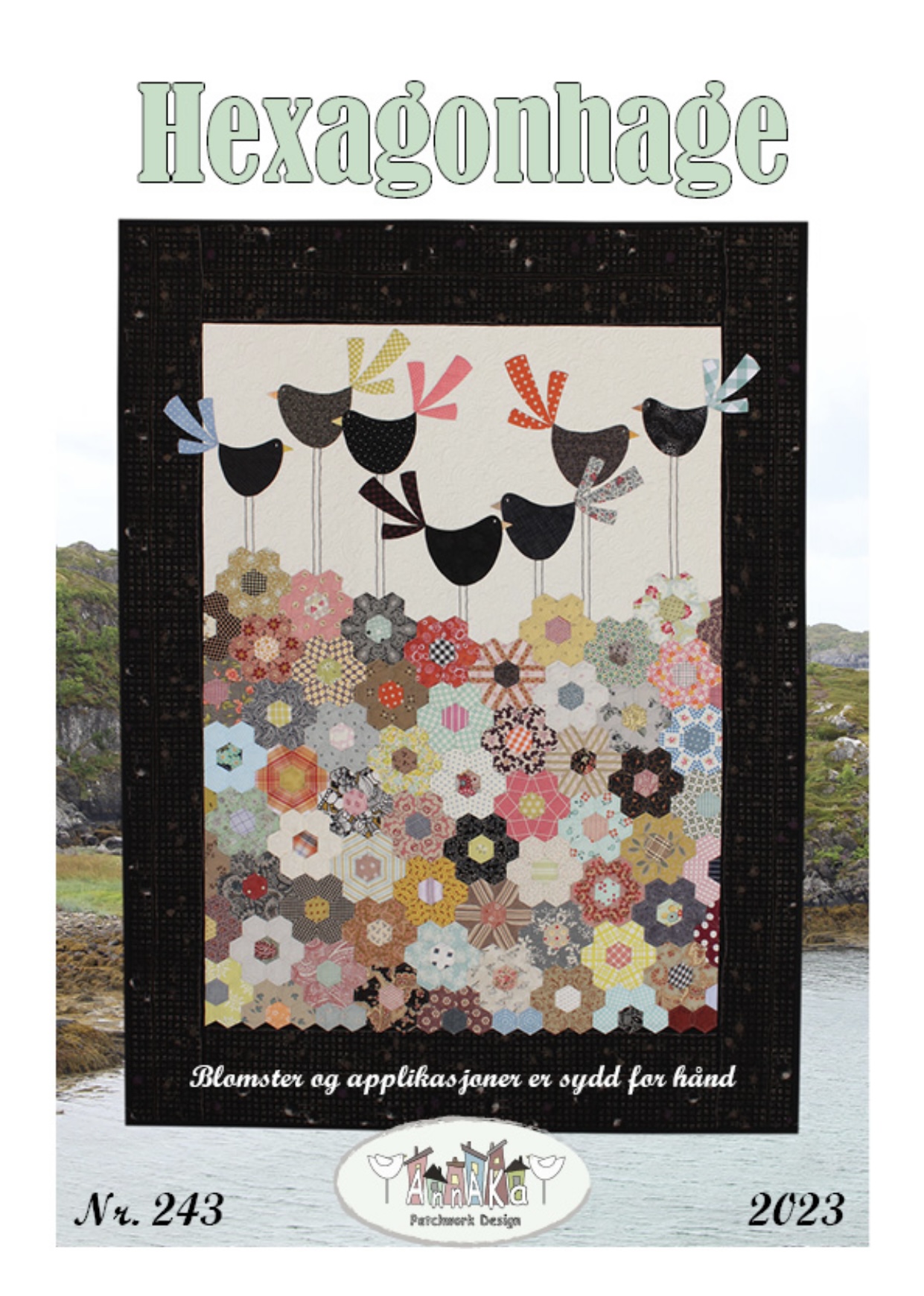 EPP teknikk (English paper piecing. Mal på applikasjon og hexagon ligger i mønstret. Blomster og applikasjoner er sydd for hånd
