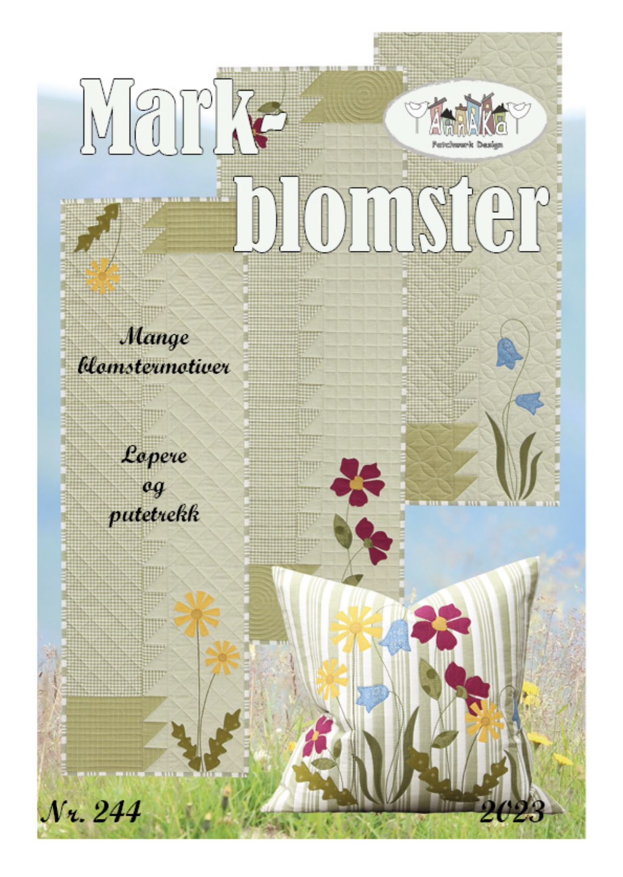 Beskrivelse Løper og putetrekk med applikerte markblomster. Sommerlige og flotte modeller med mange muligheter. Mange blomstermotiver til applikasjon i mønsteret. Patchwork-teknikk og quilting er enkel. Mål; Løpere: 14 1/4" x 44" (36 x 111,5 cm). Putetrekk: 19 3/4" x 19 3/4" (50 x 50 cm). |