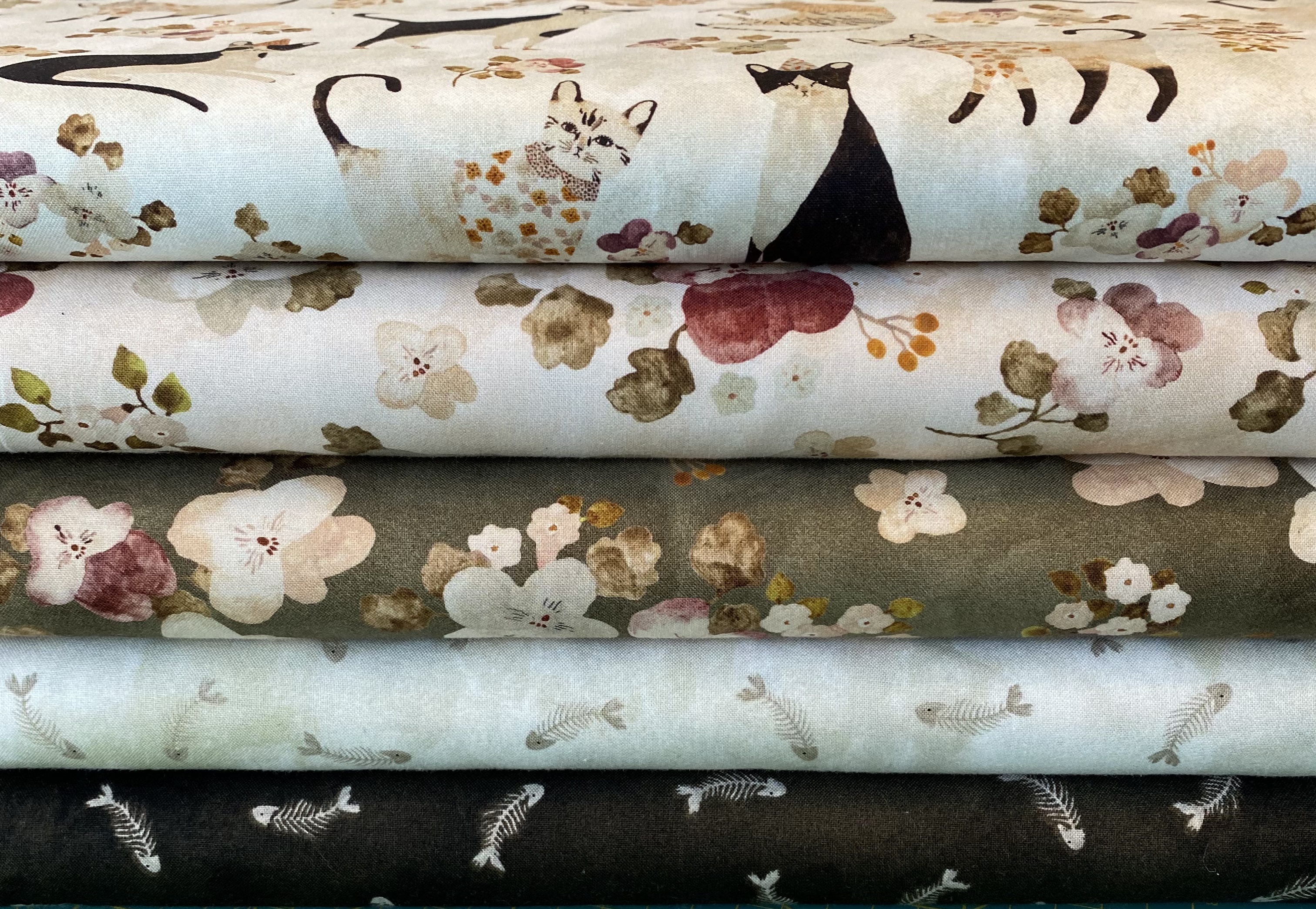 Beskrivelse Katter er alltid populære stoffer. Her kan du kombinere med fiskeben , eller ta opp de blomstene som er i kattestoffet. Stoffene er i 100% fast bomull med bredde på ca.110 cm. Høyden på kattene er ca 7-8 cm. Det samme gjelder blomstene. Fiskene måler ca.2,5 cm |
