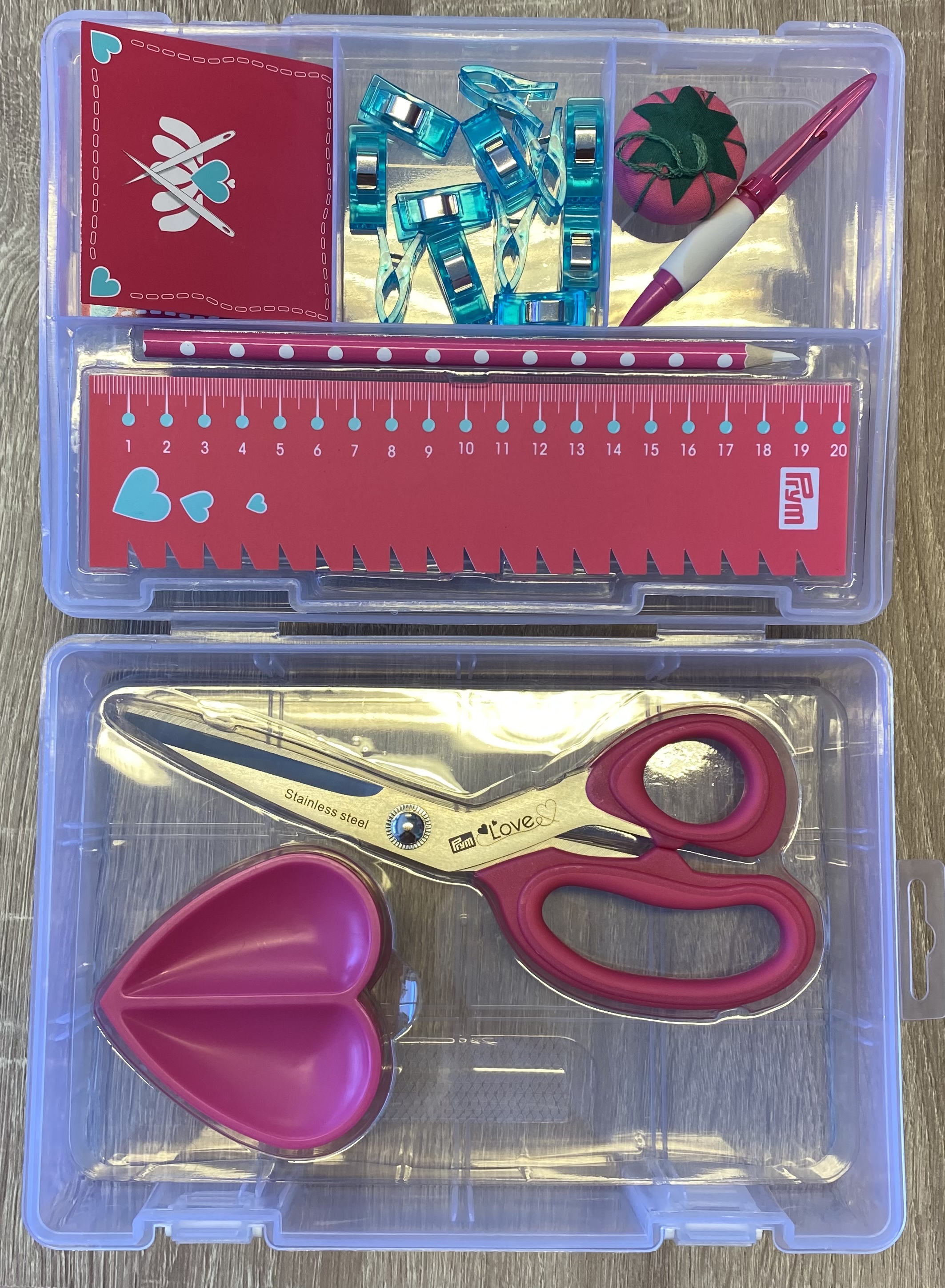 Beskrivelse Et flott syskrin fra Prym som passer bra til nybegynnere. Syskrinet inneholder en boks for oppbevaring, saks, liten nålepute, 12 klips, sprettekniv, kalkerblyant, hjerte magnetskål med mangnet, 15 synåler. Finnes i rosa og turkis |