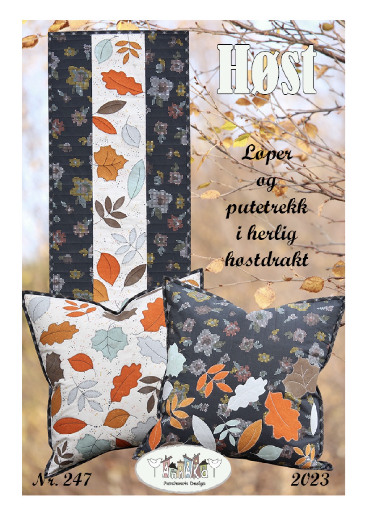 Løper og putetrekk i vakker høstdrakt. Enkel søm med maskin applikasjon. Putene har quiltet baksider med glidelåslukking. Løper måler 37 x 108 cm og Putetrekk 50 x 50 cm
