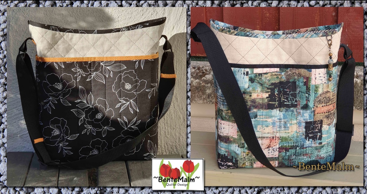 Beskrivelse Skulderveske, der nedre del danner to store ytterlommer. Disse lukkes med magnetknapp. Selve vesken lukkes med en stor trykknapp (som holder litt bedre enn magnetknappene). Str: 11” x 13 1/2” x 4” (28 x 34 x 10 cm) (b x h x d) (bredde målt langs nedre kant, høyde målt i sidesømmen) Materialliste: Oppgitt mengde menes hel stoffbredd (110 cm), der ikke annet er nevnt. Stoff C er halvlin, men sammen mengde brukes også til vanlig quiltestoff (i 110 cm bredde) |