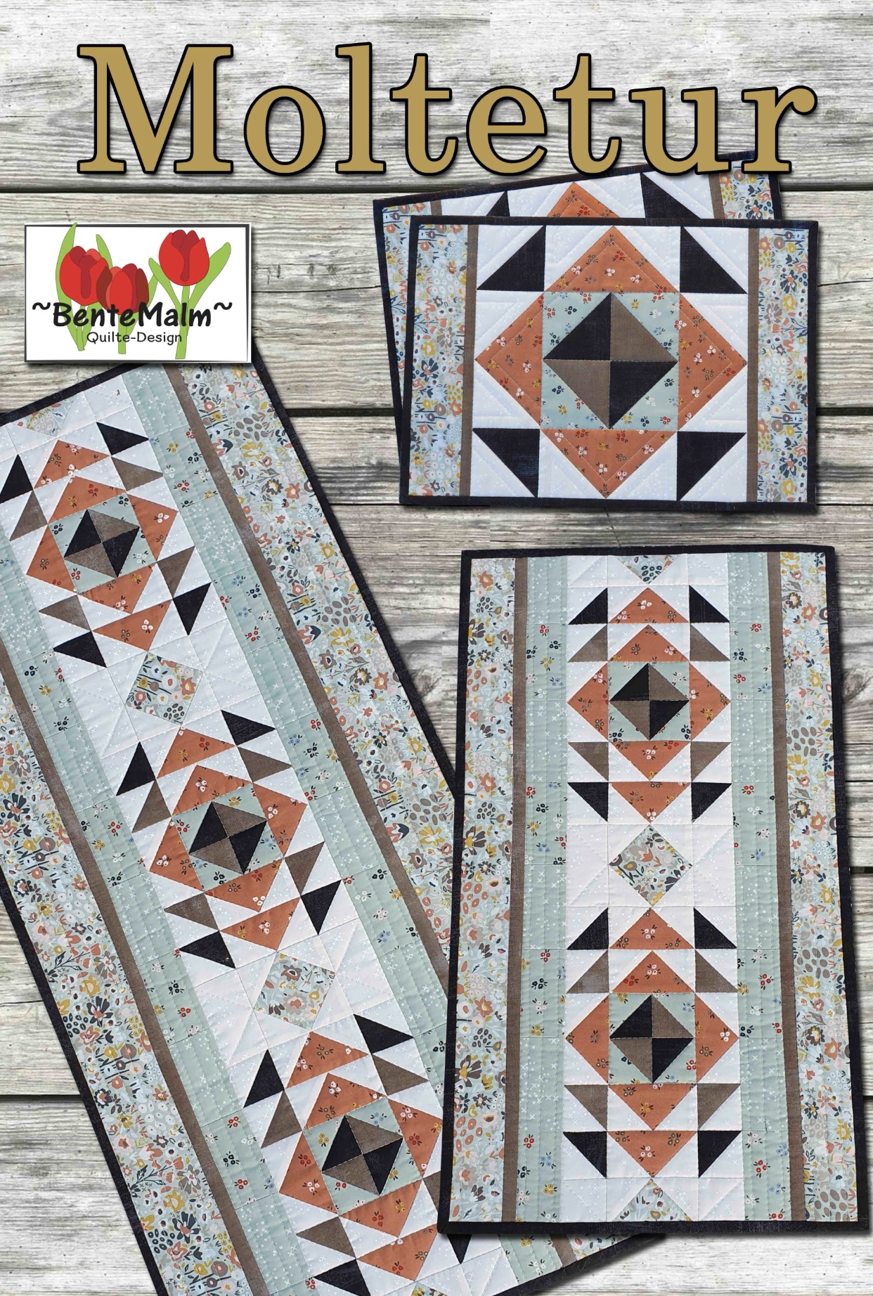 Beskrivelse Moltetur: Løper i 2 forskjellige størrelser, og spisebrikke. Navnet kommer fra fargen på stoffene, som sender tankene mot en vakker moltemyr i varme høstfarger. Str: Stor løper: 15 1/2” x 36 1/2” (39 x 93 cm) Liten løper: 13 1/2” x 24 1/2” (34 x 62 cm) Spisebrikke: 17 1/2” x 12 1/2” (44 x 32 cm) Teknikker: Tradisjonell lappeteknikk, quilting med rettsømsfot / overtransportør. Sømrom: 1/4”. Bruk inchfot / patchworkfot. Materialliste: Oppgitte mål menes hel stoffbredd (110 cm) Spesiallinjaler: Deb Tuckers linjaler: Square 2 og Tucker Trimmer er gode, men ikke nødvendige hjelpemiddel Materialliste for både stor og liten løper finnes på omslagets innside. Stoff D og E er fra er fra Ann og Bentes ønskeliste / Basicstoffer. |